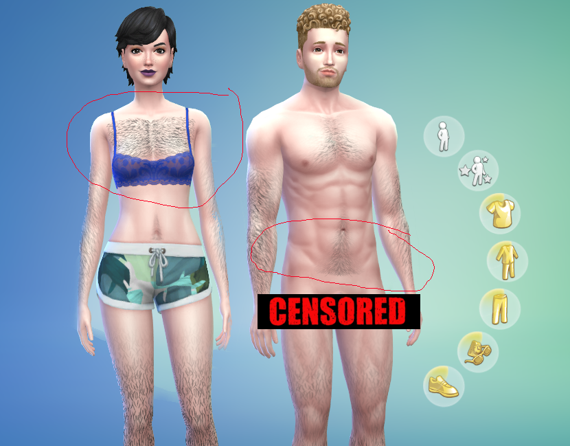- Colors: Logical mapping is used for the 24 EA colors. Sims with unnatural hair (green, blue, etc.) get blonde body hair to keep things looking realistic.