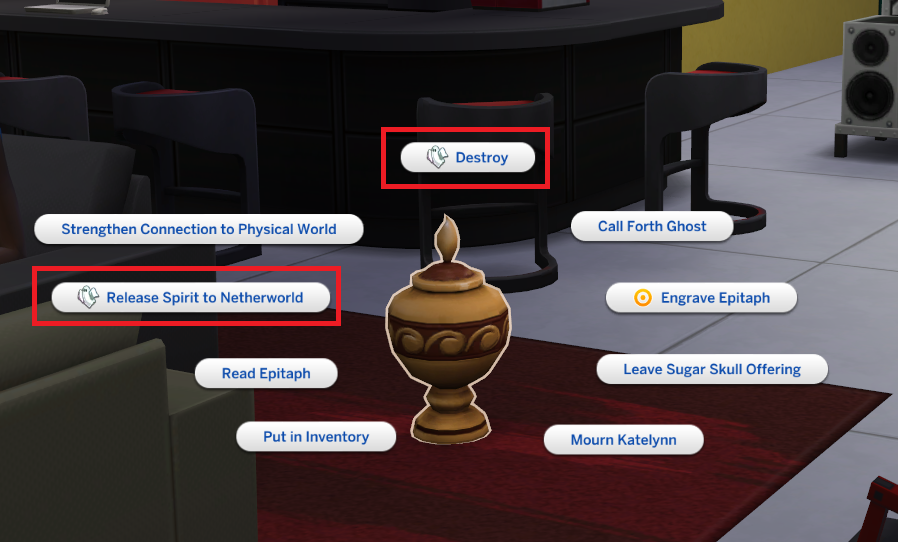 - Inventory Management: Empty urns or those containing ghosts can be destroyed directly from a Sim’s inventory.
